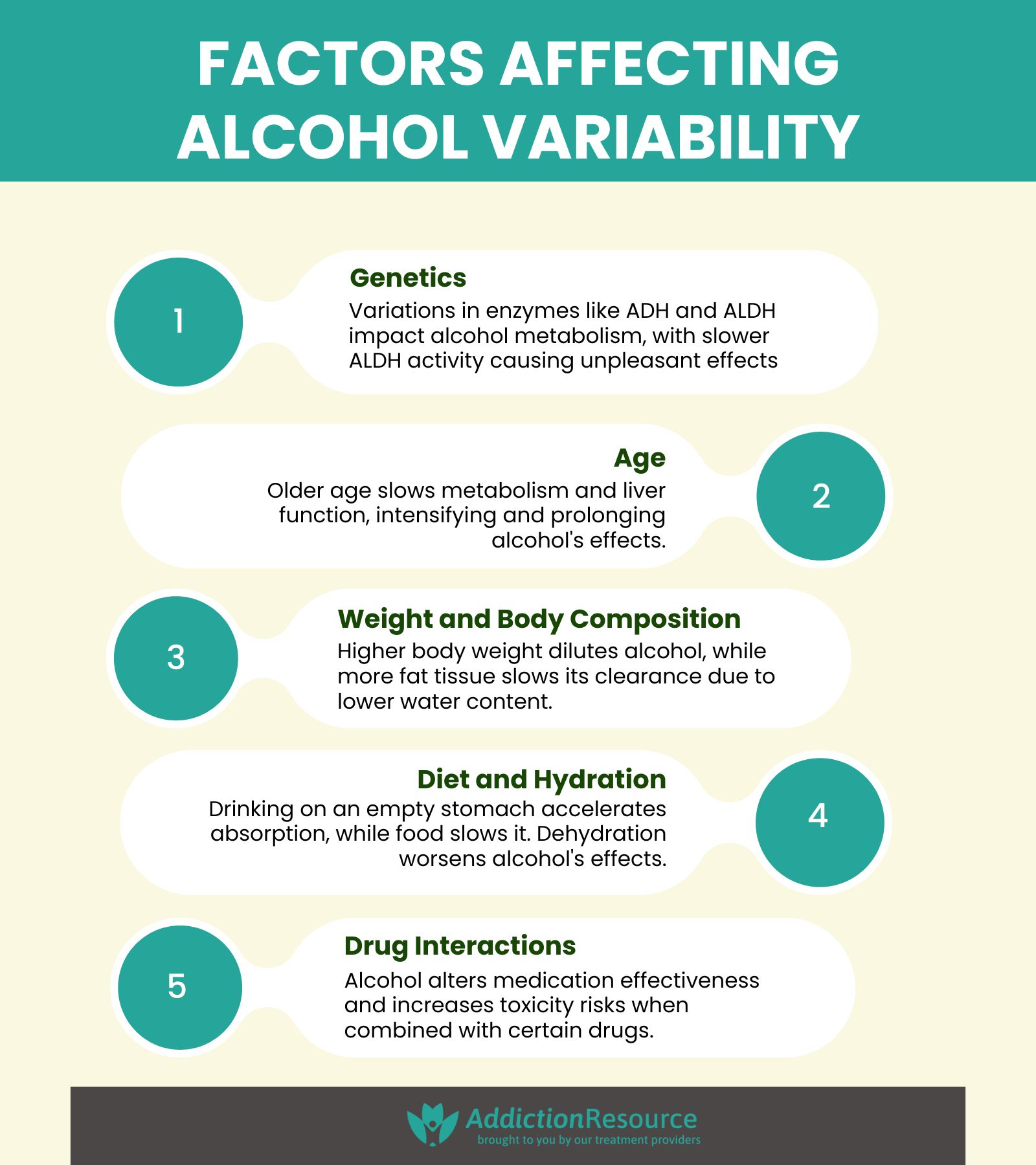 The factors that affect alcohol variability include genetics, age, weight, diet, and other drugs. These individual and environmental influences determine how alcohol is metabolized and its effects on the body. These factors impact alcohol’s effectiveness, absorption rate, and potential side effects, leading to varying responses among individuals.