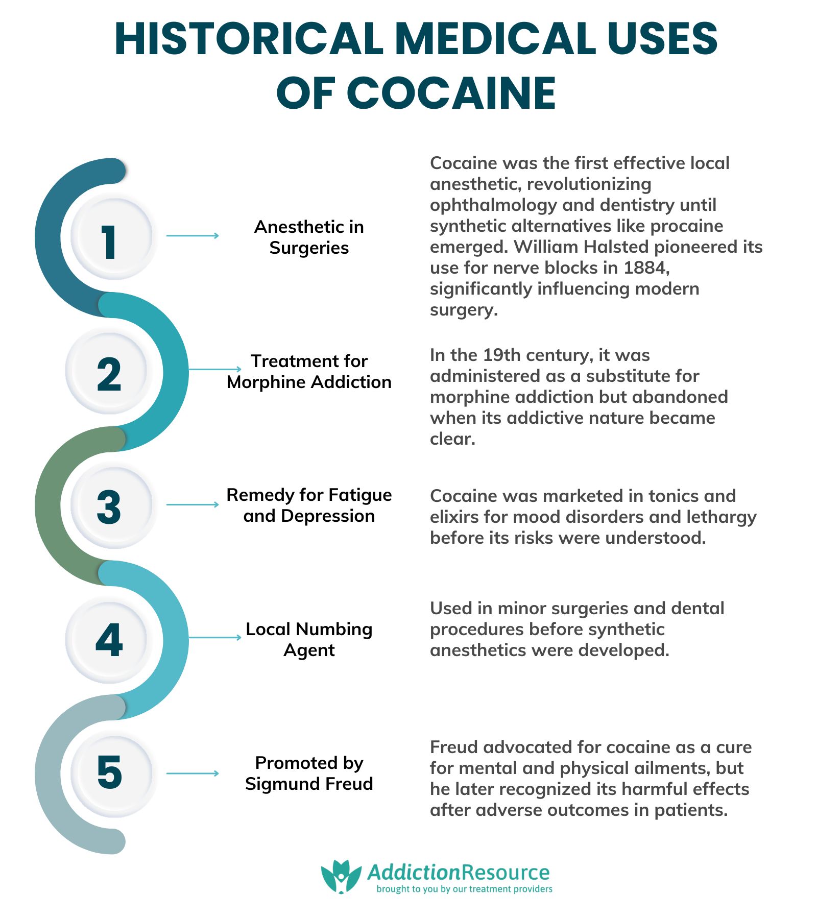 - Anesthetic for surgeries: Cocaine was the first effective local anesthetic, particularly used in ophthalmology and dentistry, where its numbing properties allowed precision without significant pain. It revolutionized surgical procedures until synthetic alternatives like procaine (Novocaine) were developed. In 1884, cocaine was used for the first time for nerve block by William Halsted, according to a study by Olch PD. William S. et al. 1975, titled โHalsted and local anesthesia: contributions and complications.โ Halsted had a great influence on modern surgery, and notably, he was one of the founders of the Johns Hopkins School of Medicine. He made many remarkable discoveries in the field of anesthesia and was a pioneer in the field.
